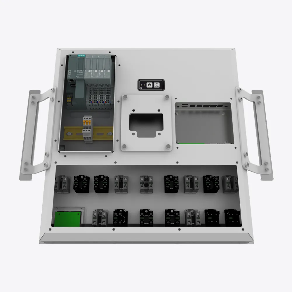 La interfaz frontal configurable admite conexión directa a los circuitos de control de la máquina o integración con módulos I/O compatibles con distintos protocolos industriales, incluyendo Ethercat y Profinet. La construcción robusta soporta discos estándar y SSD, ofreciendo máxima capacidad de almacenamiento (hasta 4TB y 64GB RAM). Incorpora pantalla TFT LED y alimentación DC.