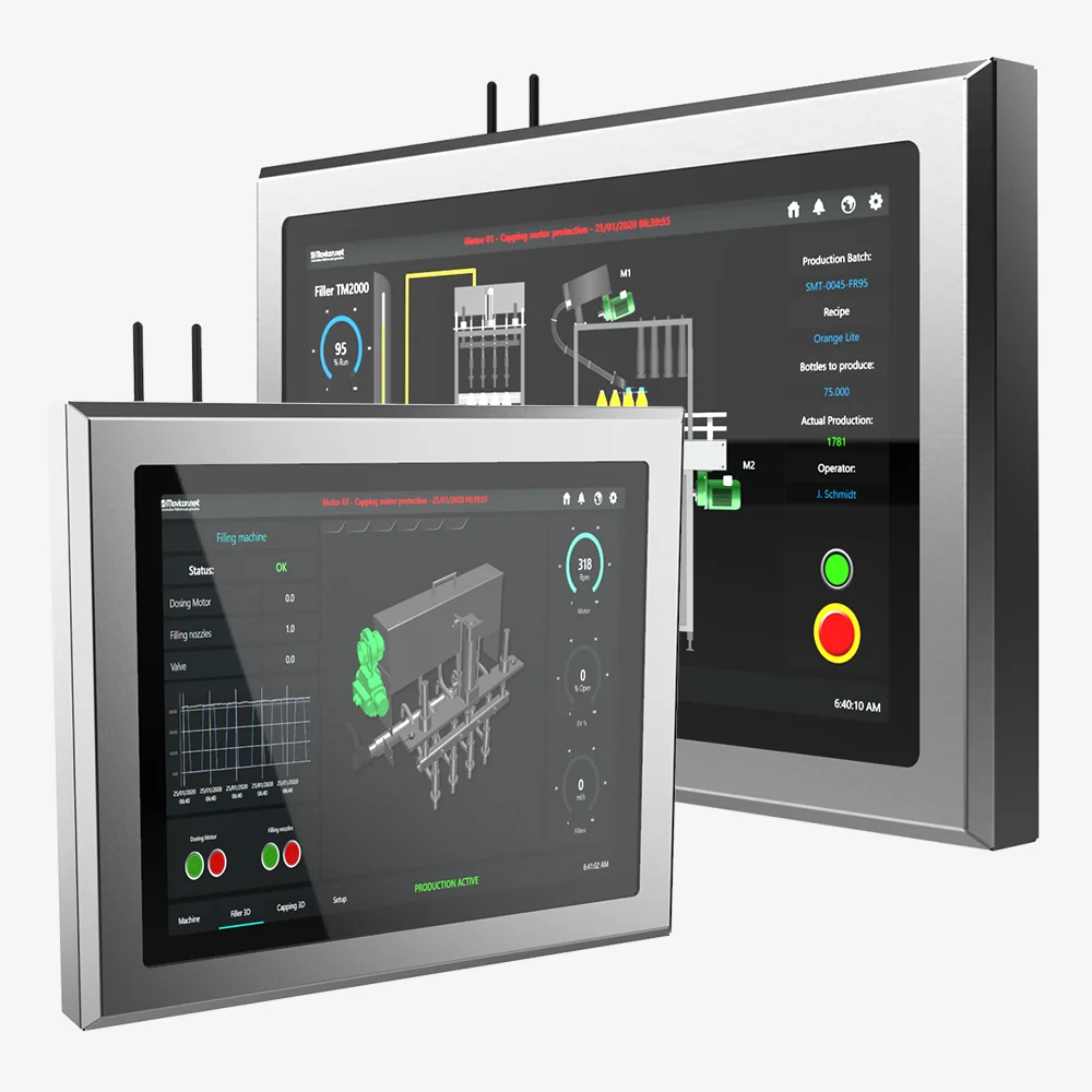 En cuanto a la instalación, la serie Hybernis ofrece brazos de acero inoxidable para montaje en techo, suelo o pared, además de soporte VESA, permitiendo crear workstations completas con pulsadores frontales, teclado, trackpad y lector RFID integrados. Esto facilita su uso como consola de mando en líneas de envasado, salas de mezcla, zonas de pesaje o estaciones CIP/SIP donde se requiere control local seguro.