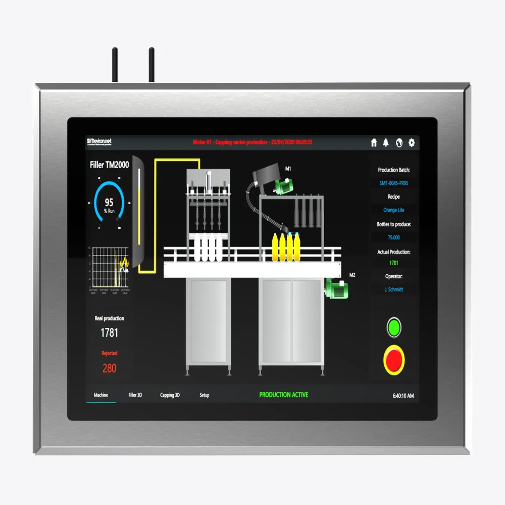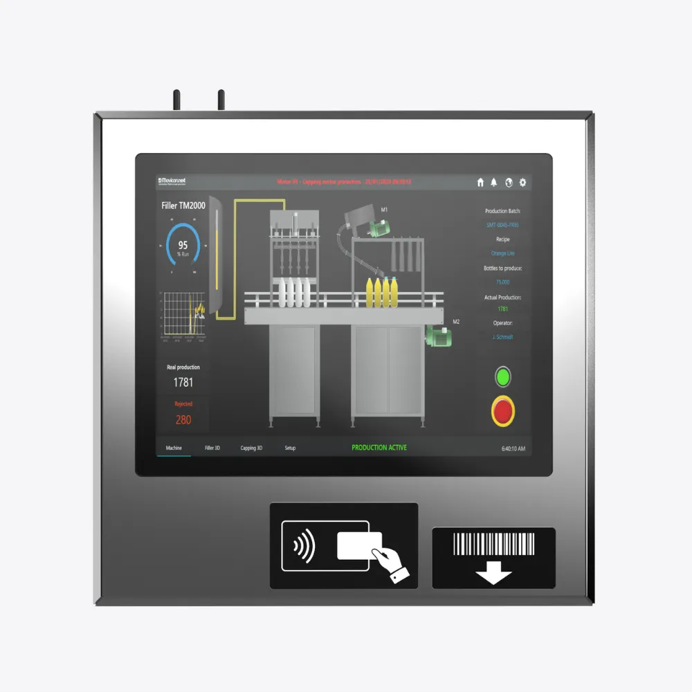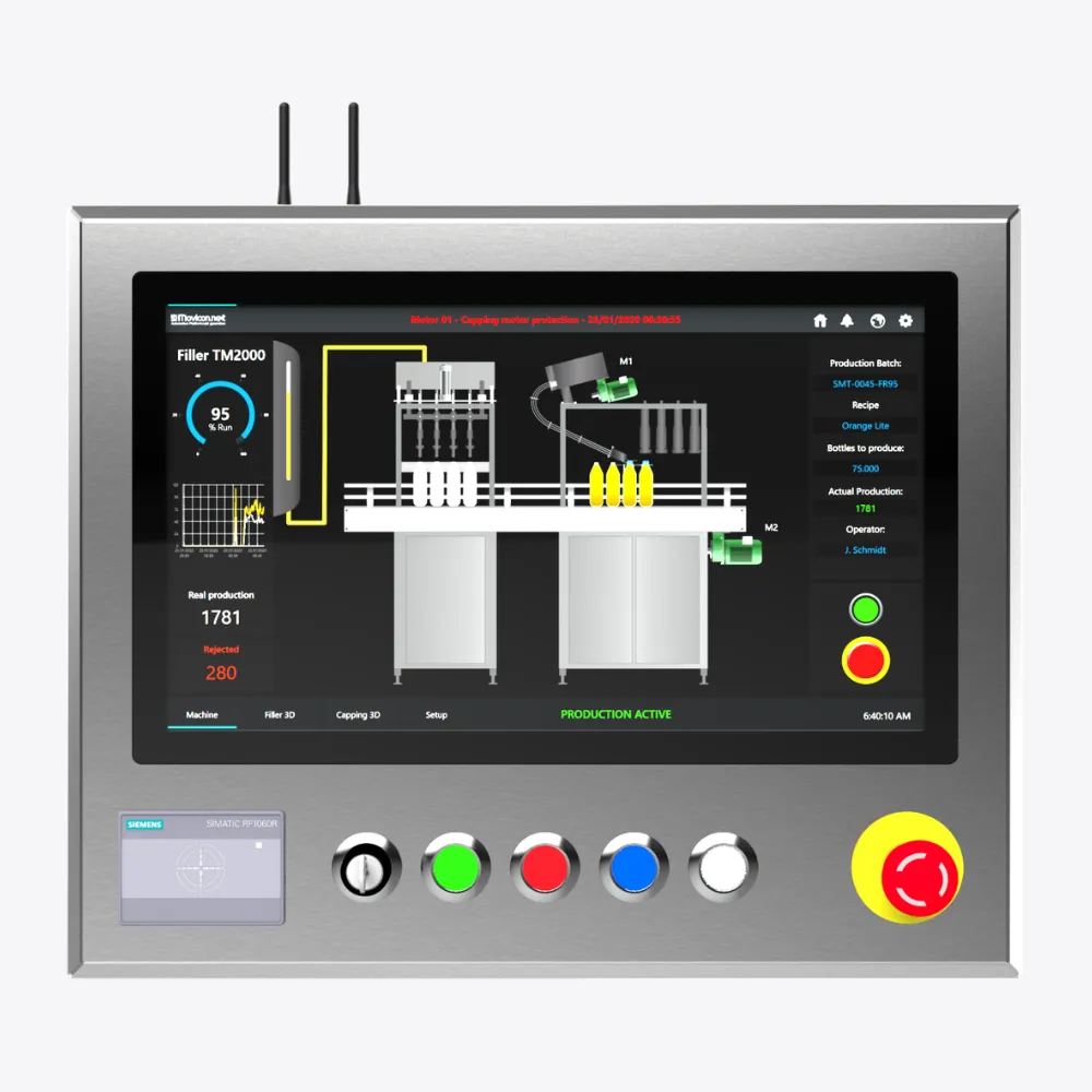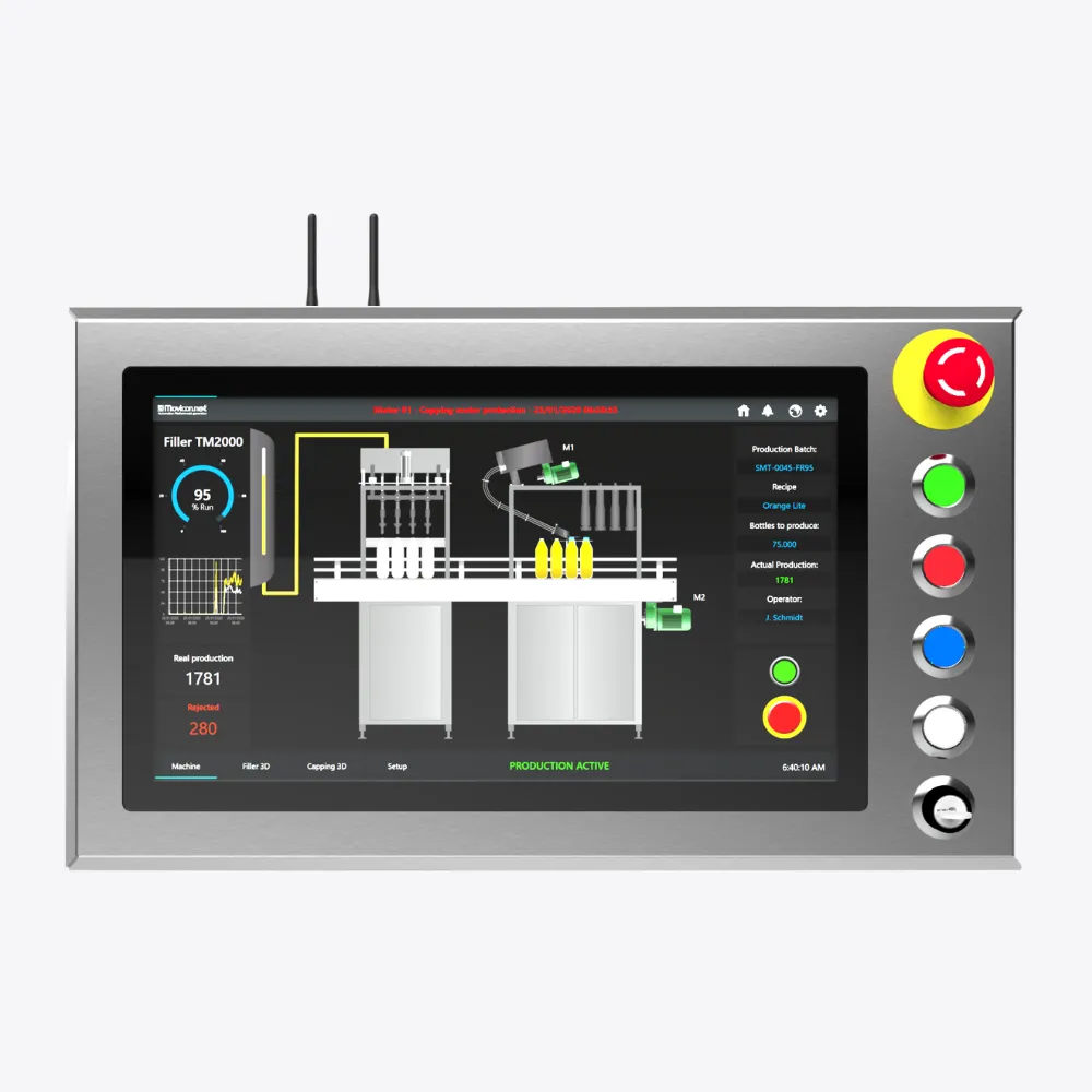 El frontal TrueFlat con pantalla táctil capacitiva de 10 puntos y cubierta negra facilita una limpieza rápida y evita acumulación de suciedad, cumpliendo los estándares de diseño higiénico en alimentación, químico, farmacéutico y agroalimentario. La protección Full IP65 del conjunto y los conectores traseros IP67 (LAN, USB, COM, alimentación) garantizan estanqueidad frente a polvo, agua y chorros a presión, y los cables de serie de 5 m simplifican el conexionado incluso en instalaciones complejas.