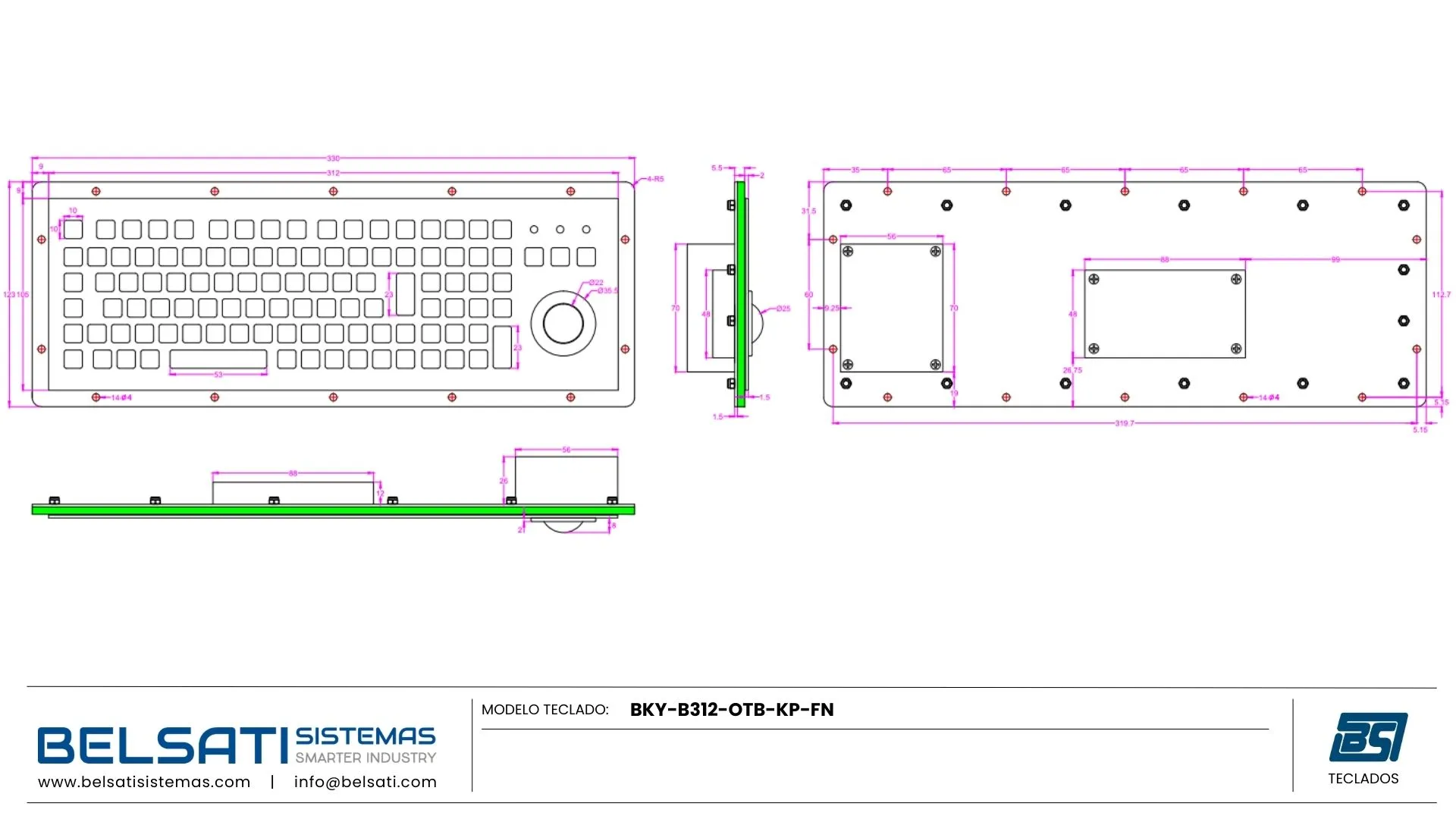 El BKY-B312-OTB-KP-FN es un teclado industrial empotrable de alto rendimiento, fabricado íntegramente en acero inoxidable cepillado para garantizar máxima resistencia mecánica y protección frente a golpes, vandalismo y corrosión en entornos exigentes. Su diseño ultra fino y compacto (312,0 mm x 105,0 mm) optimiza el espacio en paneles, pupitres de control y terminales industriales donde cada centímetro cuenta. Tanto la placa frontal como la posterior son de 1,5 mm de acero inoxidable de alta calidad, lo que mejora la rigidez y la durabilidad a largo plazo.