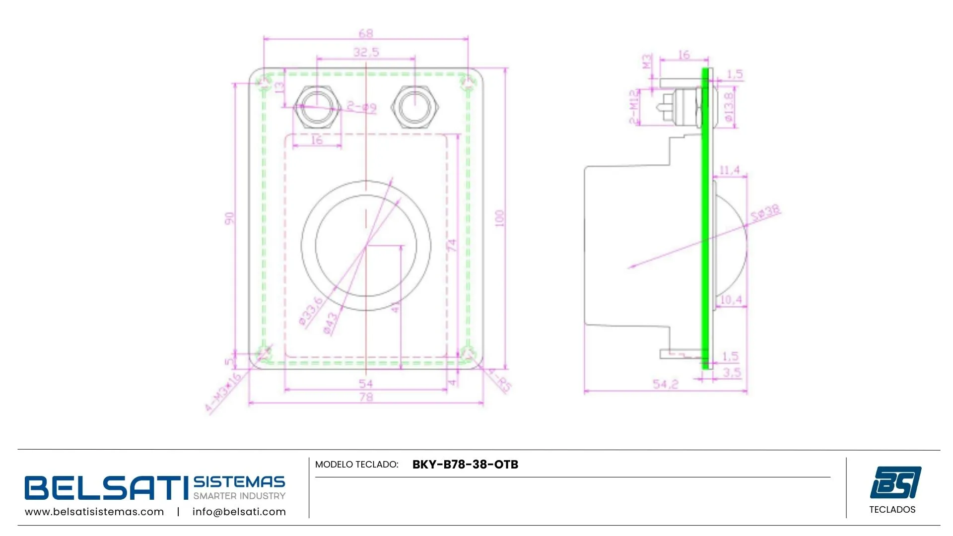 En cuanto a resistencia ambiental, el teclado BKY-B78-38-OTB trabaja en rangos de temperatura de -20 ºC a +65 ºC, con humedad relativa del 30% al 90% y presiones de 60 a 106 kPa, lo que lo hace adecuado para instalaciones en interior y exterior cubierto. Está orientado a sectores como industria pesada, minería, petróleo y gas, automatización de procesos, entornos médicos, terminales bancarias, kioscos de autoservicio y sistemas de acceso público, donde se requiere un dispositivo de puntero resistente al vandalismo y a las inclemencias del entorno. Además, puede sustituir a soluciones equivalentes como las series NSI GK38 y TBE38, ofreciendo compatibilidad funcional y altas prestaciones en un formato compacto de 78 x 100 mm.